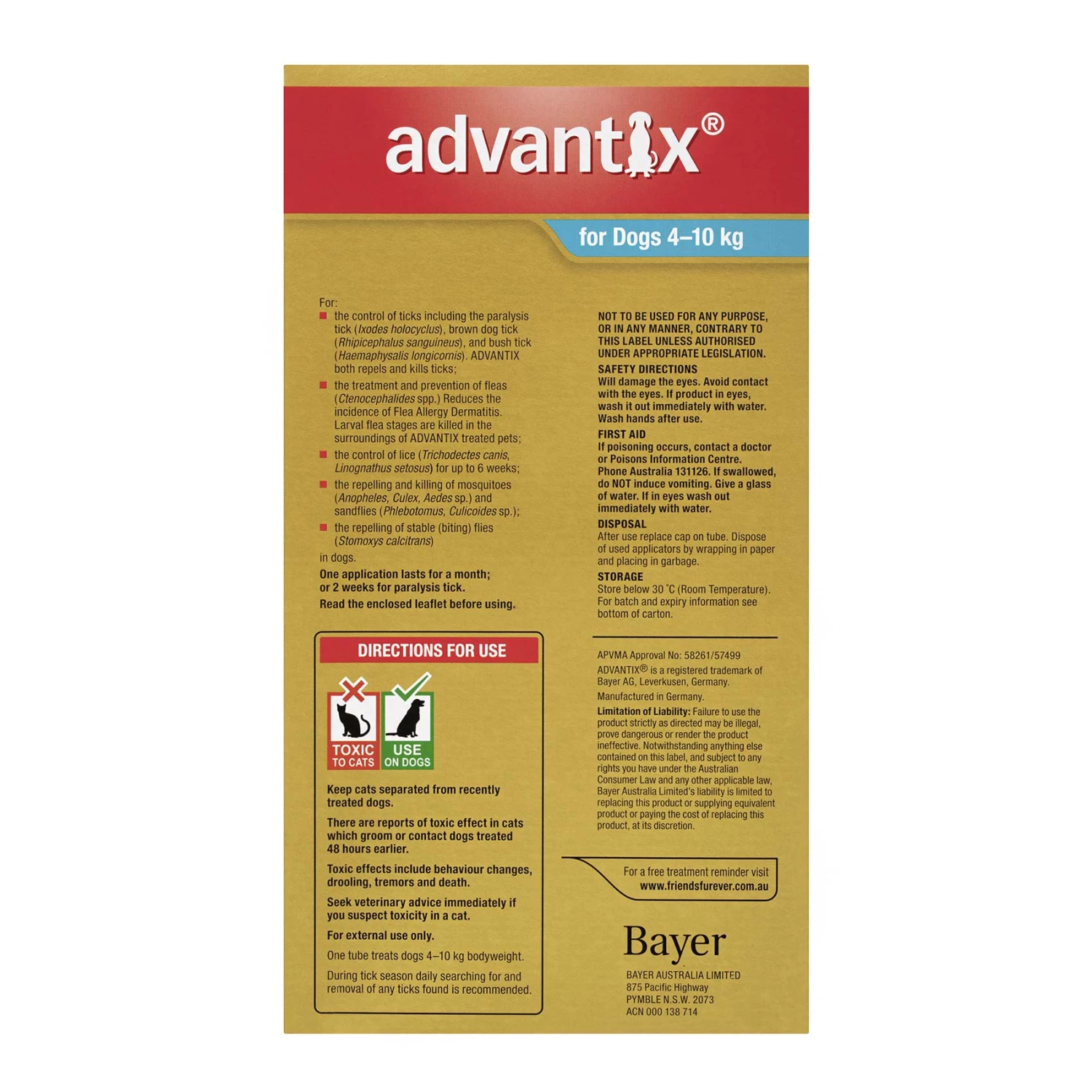 Advantix is specially formulated to repel and kill deadly Australian Paralysis Ticks. This easy-to-use spot-on is applied fortnightly, removing the worry of ticks harming your dog. Advantix also kills fleas fast. Its rapid killing power stops fleas biting within 3 to 5 minutes, killing adult fleas and their larvae within 20 minutes.