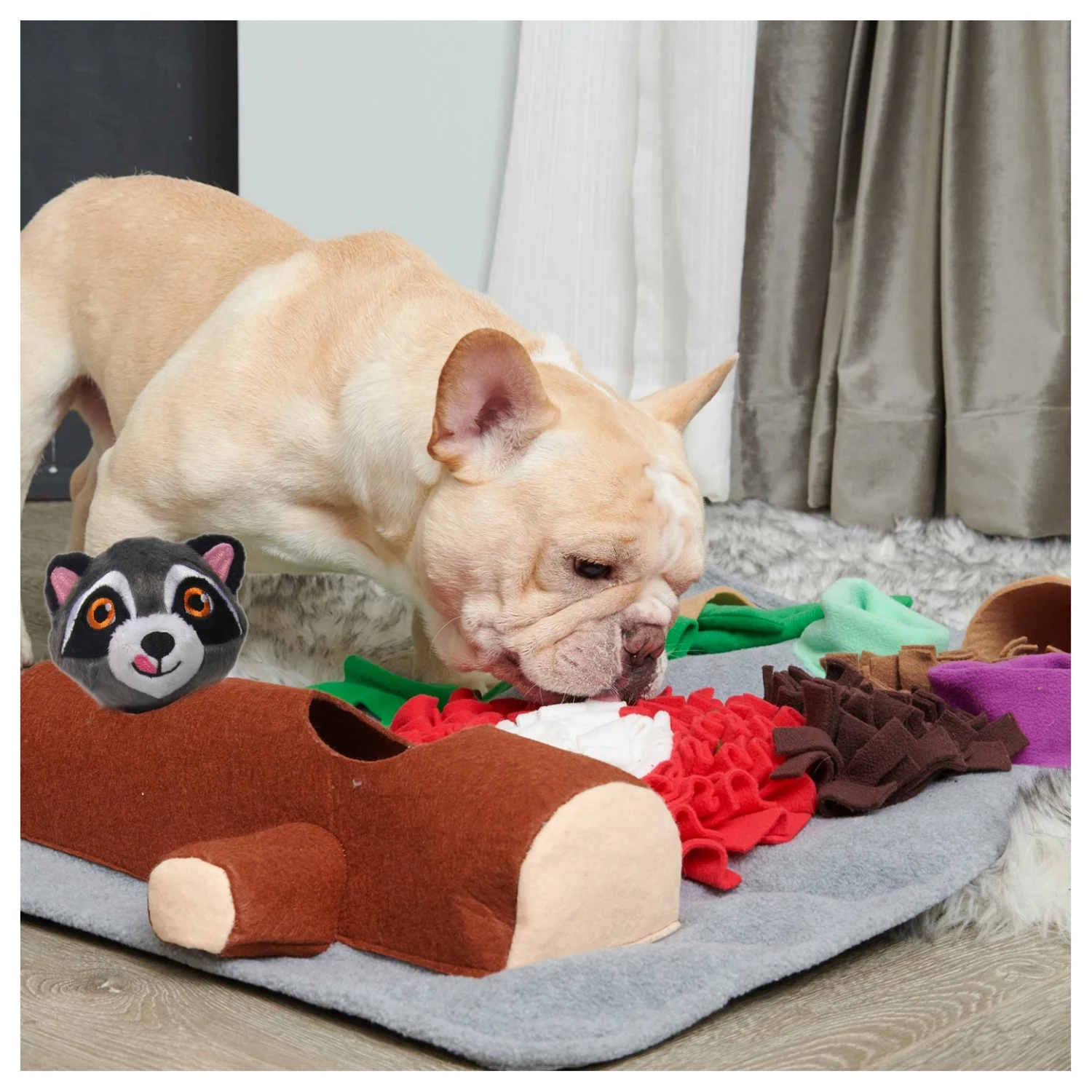 The All For Paws Dig It! Fluffy Play & Treat Mat is a specially designed dog snuffle mat with a squeaky racoon toy for endless fun.