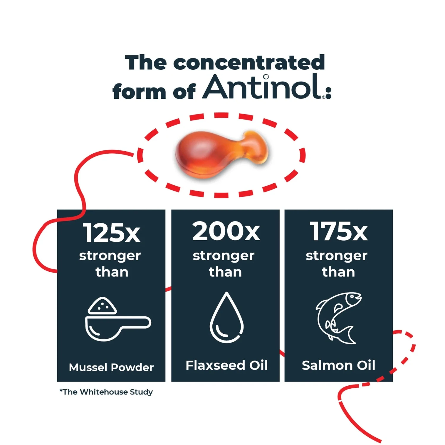 Antinol Plus is made from a patented blend of fully traceable and sustainably sourced marine lipid oils which act as a natural anti-inflammatory for better joint health and mobility. Antinol Plus is formulated from natural, stabilised and pure ingredients, and free from fillers or preservatives.