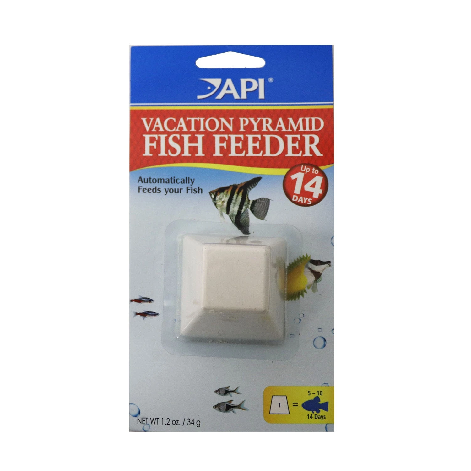 API VACATION PYRAMID FISH FEEDER should be used as a temporary substitute for daily feeding for your fish while you are away on vacation. This block, which contains a highly nutritious formula, is designed to slowly release the proper amount of food to your fish each day you are gone. This eliminates the risk of friends or neighbors overfeeding the fish, which can lead to harmful ammonia spikes in your tank. This particular feeder lasts up to 14 days, but may pollute water if your tank is left completely unattended for this length of time. Use as directed.