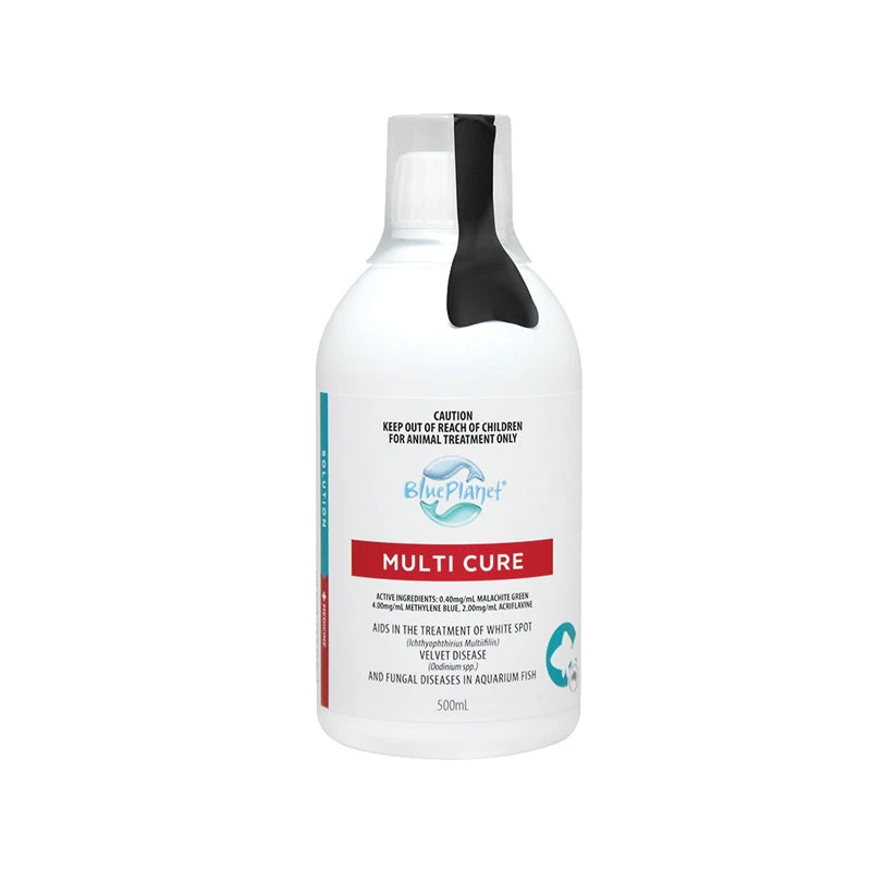 Blue Planet Multi Cure is a multi-purpose formula which is specially designed to treat White Spot (Ichthyophthirius multifillis), Velvet Diseases (Oodinium spp.) and other fungal diseases in freshwater fish (both tropical and cold water).