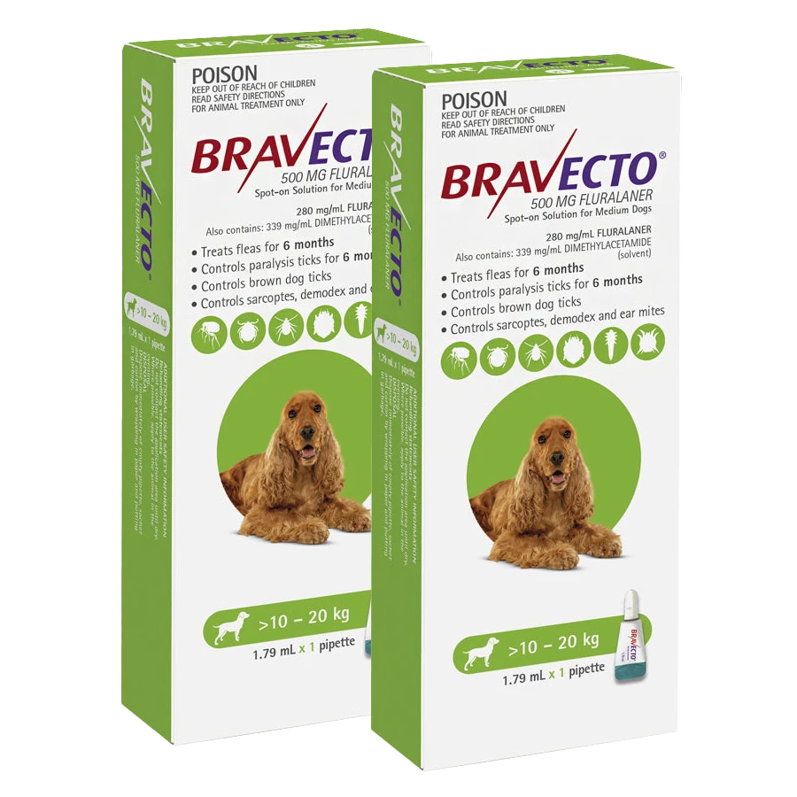 Bravecto Spot-on Green is a spot-on flea and tick treatment for medium dogs weighing between 10kgs and 20kgs that provides up to of 6 months protection in a single dose.
