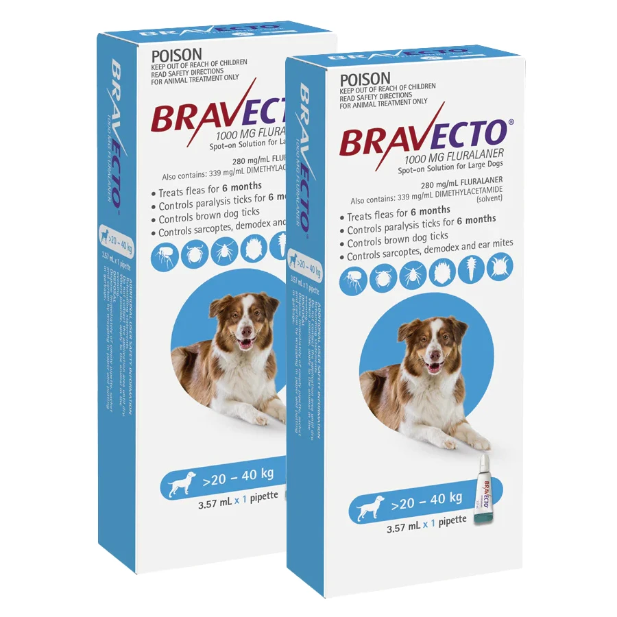 Bravecto Spot-on Blue is a spot-on flea and tick treatment for large dogs weighing between 20kgs and 40kgs that provides up to of 6 months protection in a single dose.
