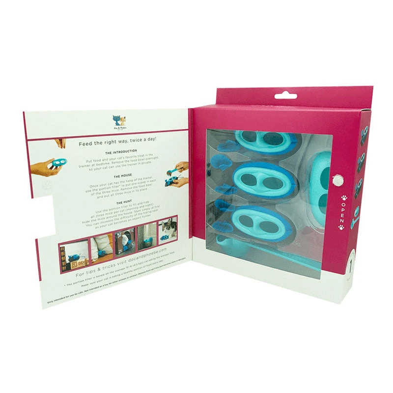 Each Doc & Phoebe’s Indoor Hunting Feeder Includes: 1 Trainer complete with multiple dispensing holes 3 Feeders each with two dispensing holes – designed for any size kibble 3 Feeder Skins to simulate the tactile feel of prey allowing your cat to grab, claw and use its teeth as it would in the hunt 1 Scoop to hold 1.6 tablespoons (approx. 1/6th the daily ration of an average 4.5kg cat)
