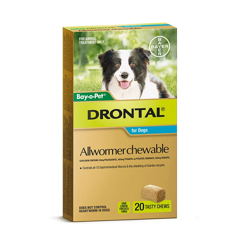 Drontal Allwormer chewables kill every type of intestinal worm found in Australian dogs, including roundworm, hookworm, whipworm and tapeworm. Drontal not only protects your dog from worms, it also provides protection for the whole family from gastrointestinal parasites.
