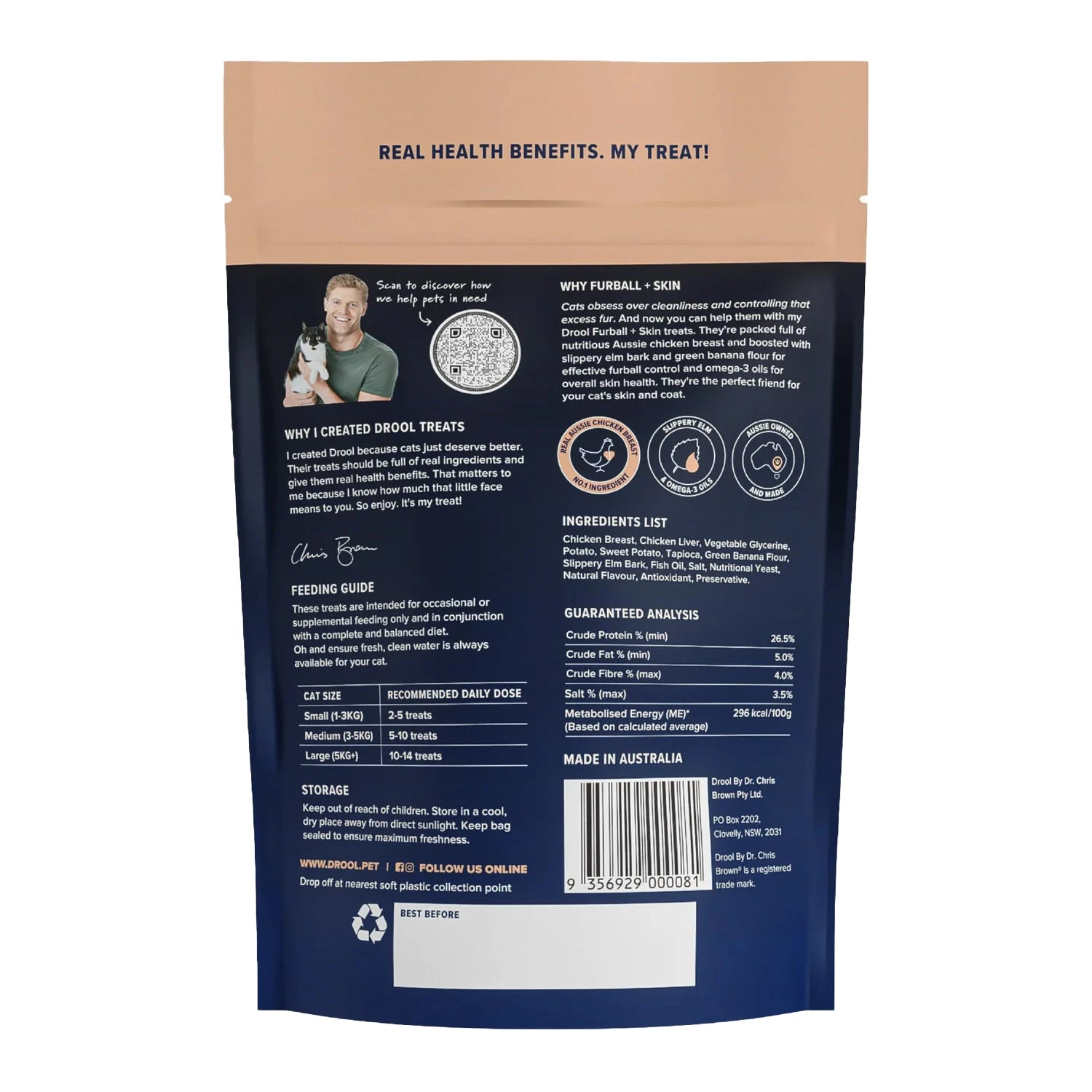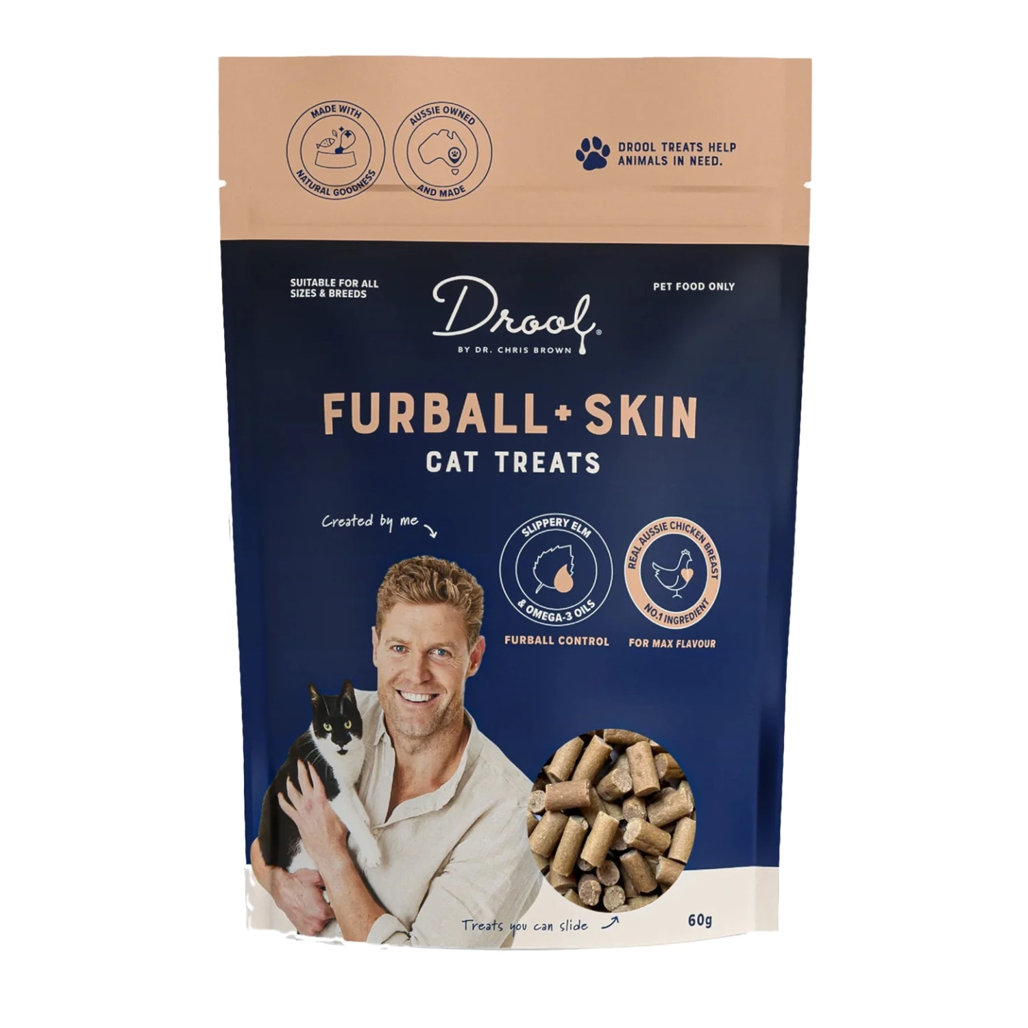 Cats obsess over cleanliness and controlling that excess fur. Luckily so can you with these Drool Furball + Skin treats. They’re packed full of nutritious Aussie chicken breast and boosted with slippery elm bark and green banana flour for handy furball control and omega-3 oils for overall skin health.
