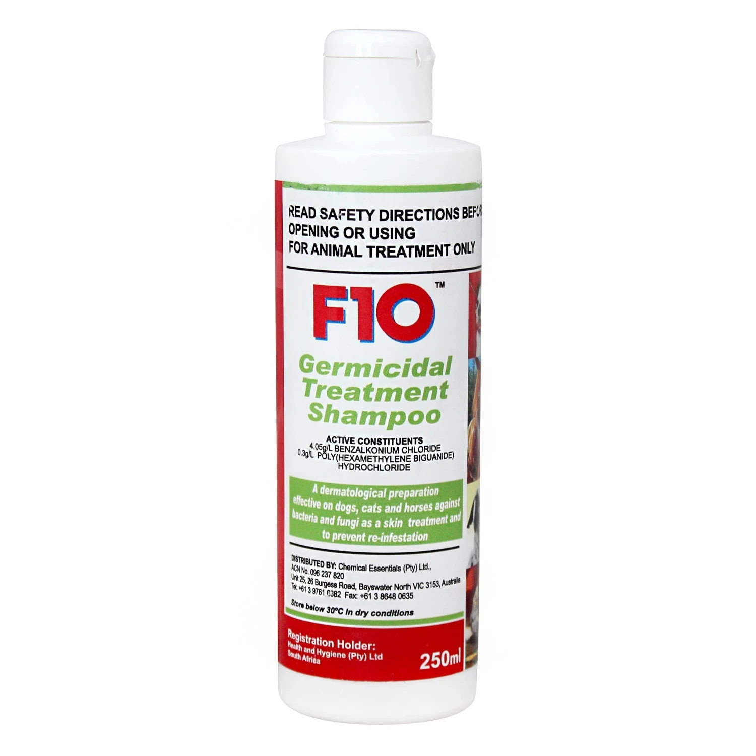 Based on F10SC Veterinary Disinfectant, F10 Germicidal Shampoo is a safe and highly effective product that is registered for use in dogs, cats and horses as a skin treatment against bacteria and fungi, and also to prevent re-infection. As such it is an excellent product for treating common conditions such as ringworm Staph bacterial infections and “hot spots”, as well as yeast infections.