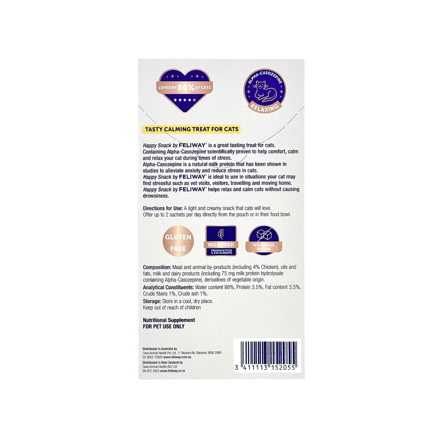 Feliway Happy Snack is a delicious lickable snack, containing a soothing natural milk protein – alpha-casozepine, for FELIWAY calming at your fingertips.