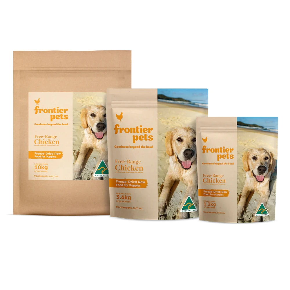 Frontier Pets Free-Range Chicken Freeze-Dried Raw Puppy Food offers a complete and balanced, raw diet that’s perfect for your growing pup. A clever freeze-drying process is used to remove water from fresh, raw ingredients, locking in all the natural goodness. This applies to all of Frontier Pets dog food too!