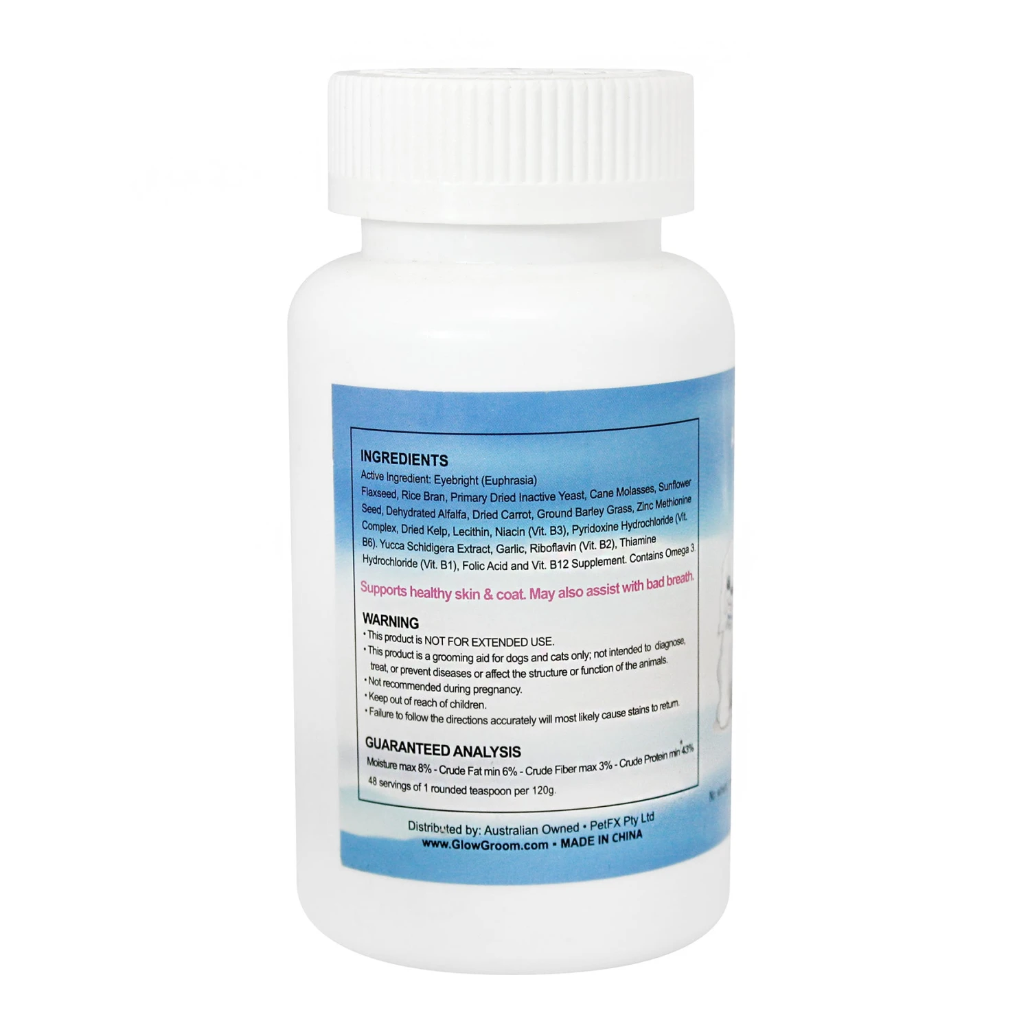 Glow Groom is a powerful anti-bacterial powder that can be added to your pets regular food or snack and is proven to eliminate tear stains from within.