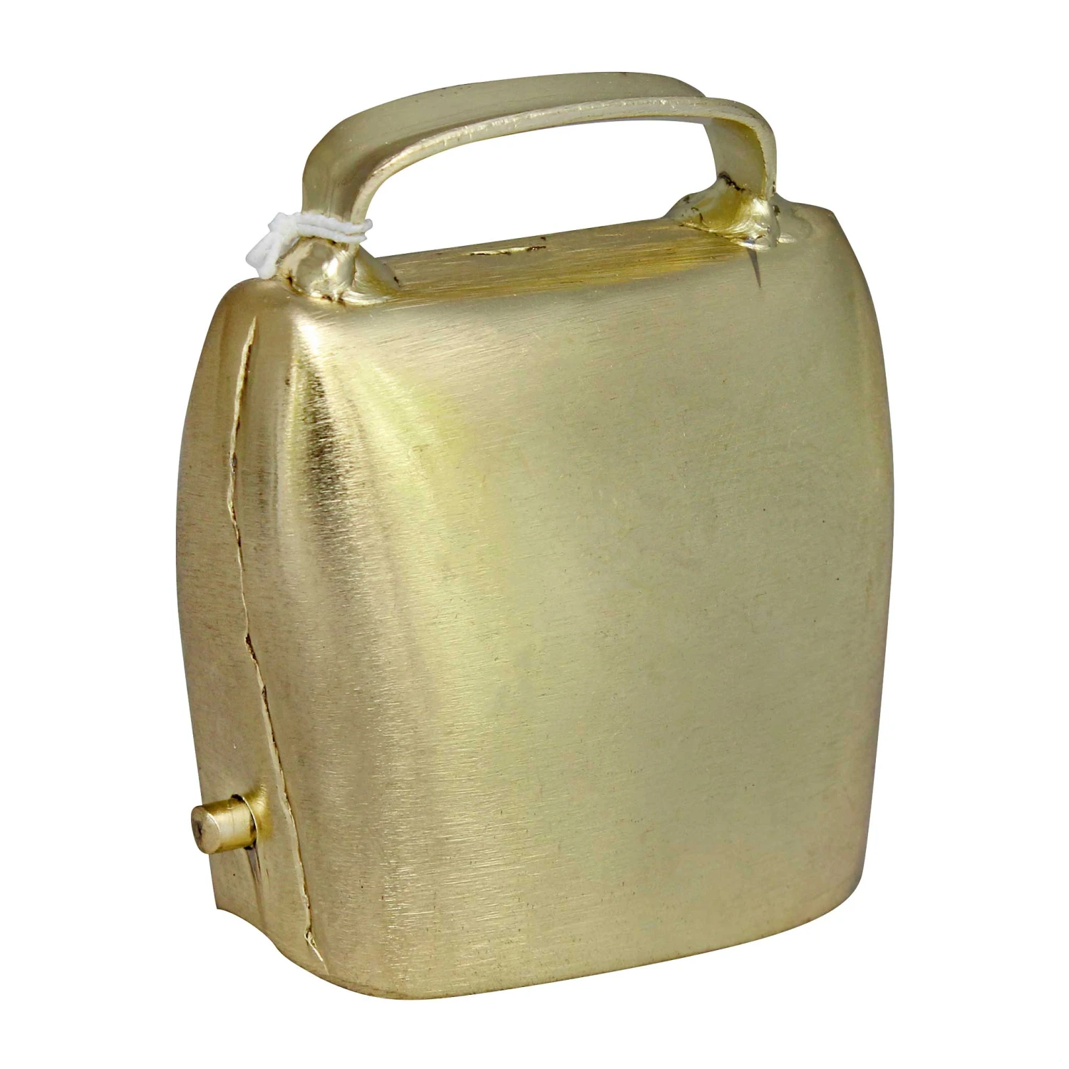 Simple brass coloured steel goat bell, 65mm wide and 75mm deep. Suitable for a collar up to 40cm wide. These bells have a distinctive sound.