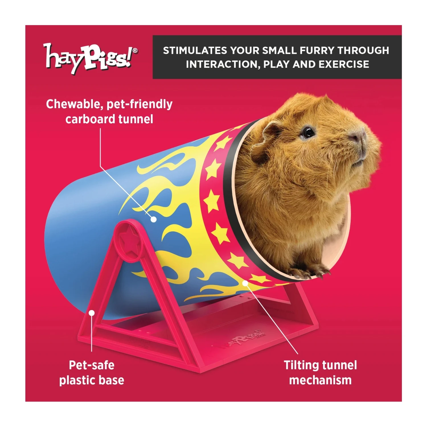The tube is perfect for hiding tasty hay in the middle of it – watch as a couple of piggies tip it back and forth to get the best bits!