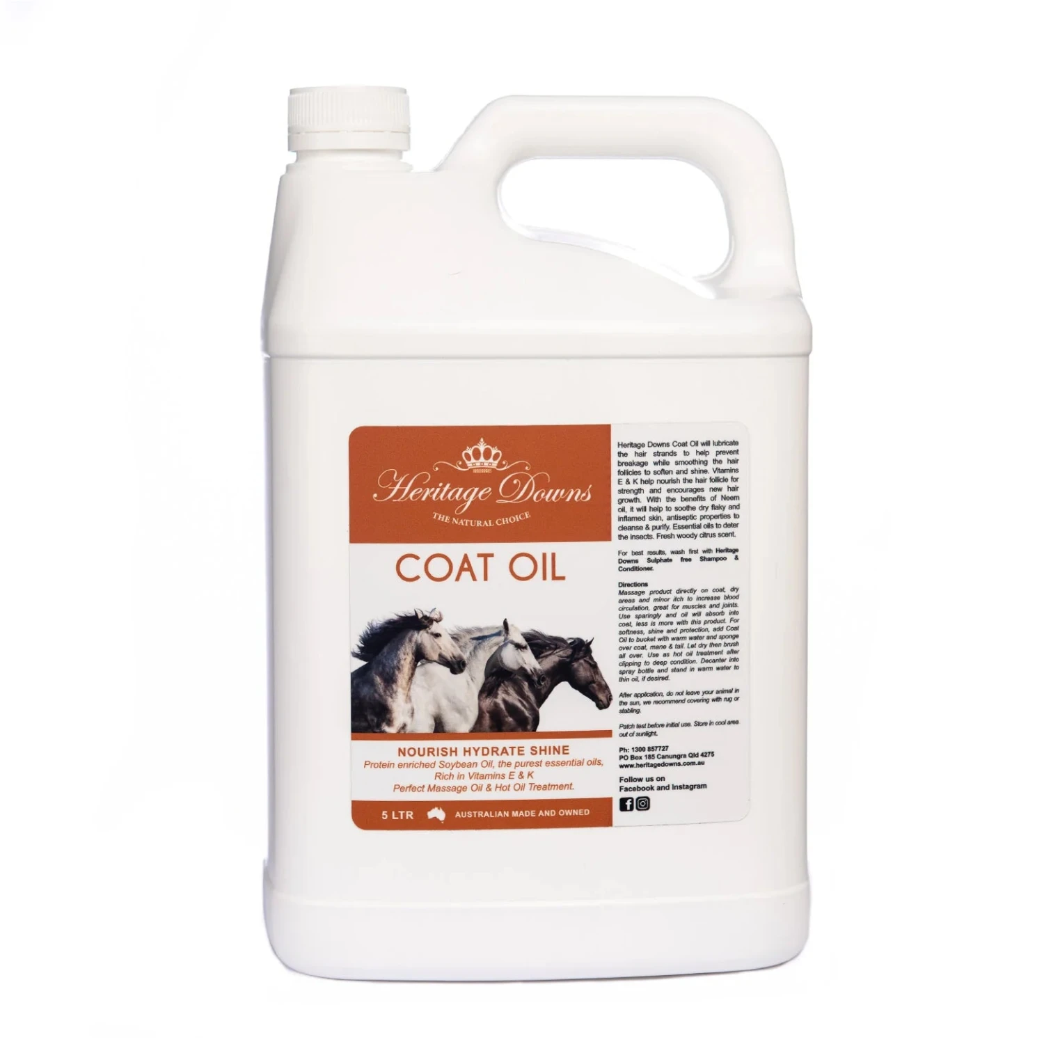 Heritage Downs Coat Oil has been specially formulated with a blend of protein enriched soybean oil, Neem Oil, Tea Tree Oil, Eucalyptus Oil, Citronella Oil and Vitamin E to nourish hair follicles, promote hair regrowth and revitalise the skin.