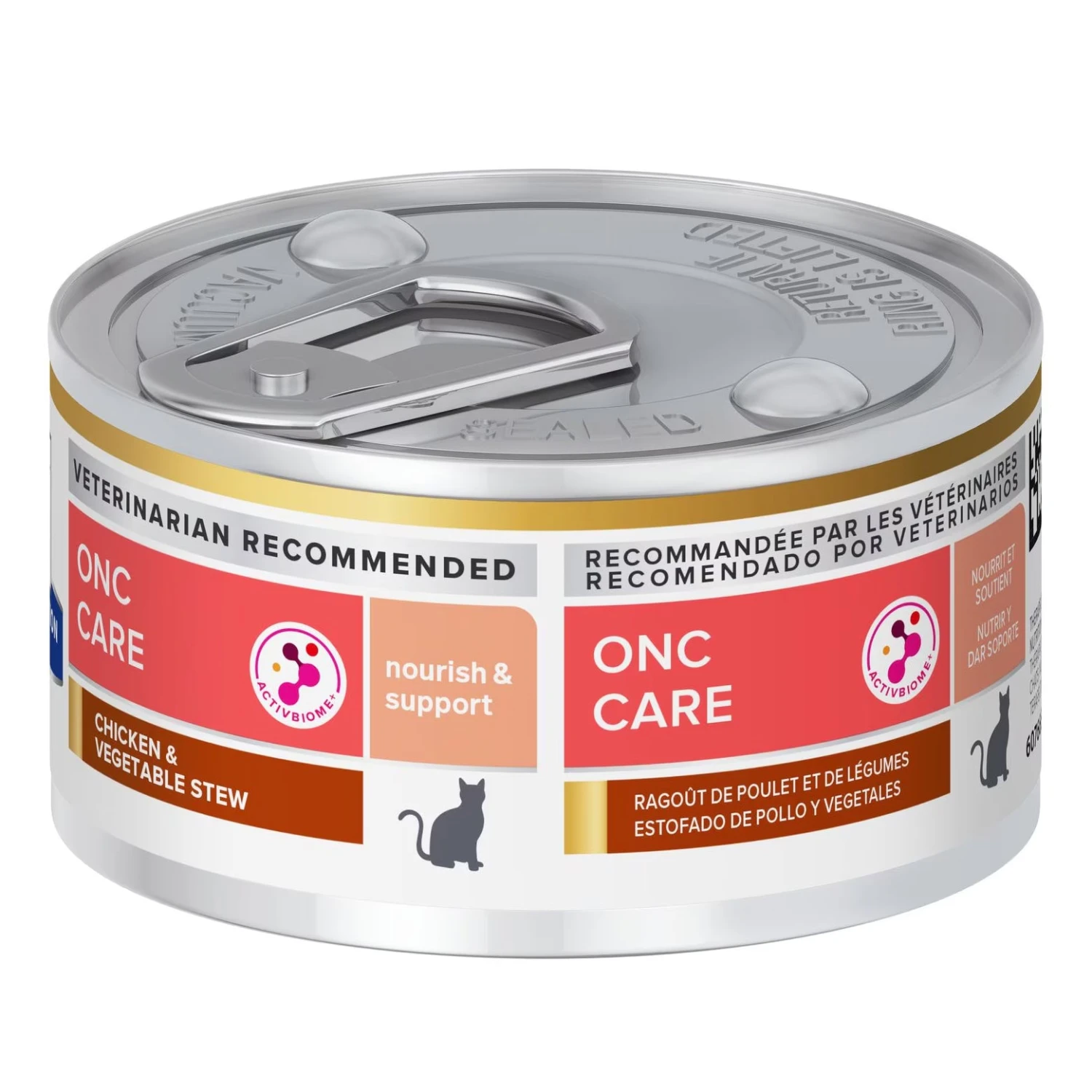 Hill’s Prescription Diet ONC Care Chicken & Vegetable Stew Cat Food is clinical nutrition designed to nourish and support cats with serious illness such as cancer.