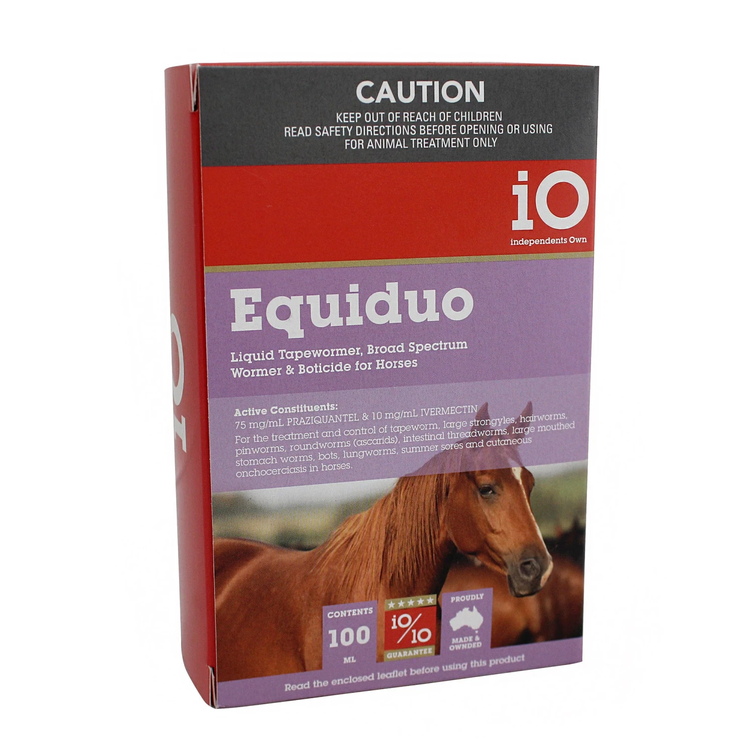 iO Equiduo (Ivermectin and Praziquantel) has been formulated for administration by oral drench or stomach tube (nasogastric intubation). One low-volume dose is effective against important internal parasites, including tapeworms and the arterial stages of Strongylus vulgaris, and bots.