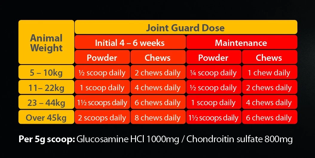 A 400g tub of Joint Guard will last the average-sized dog around 6 months once on the maintenance dose, and because it comes in a great no smell, no taste powder your dog is guaranteed to love it!