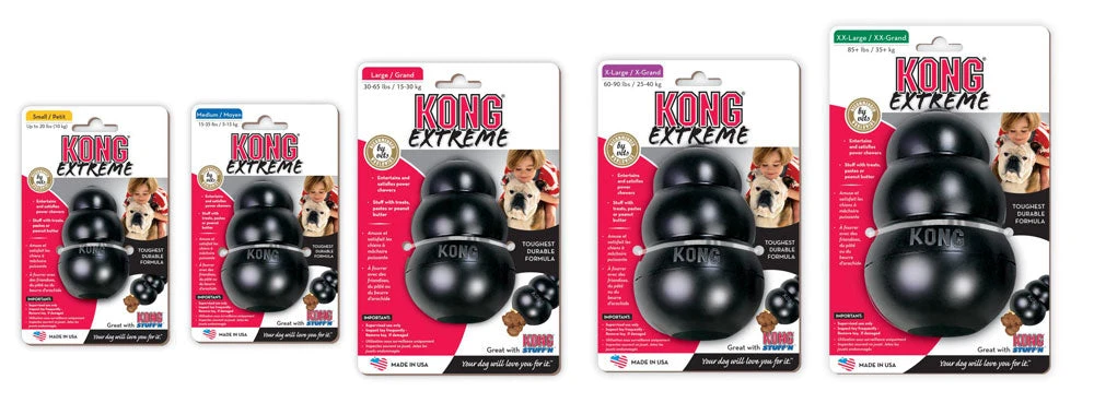 KONG Extreme represents the most durable version of the original KONG toy. The ultra-strong, ultra-durable, black rubber compound is recommended for the most powerful chewers.