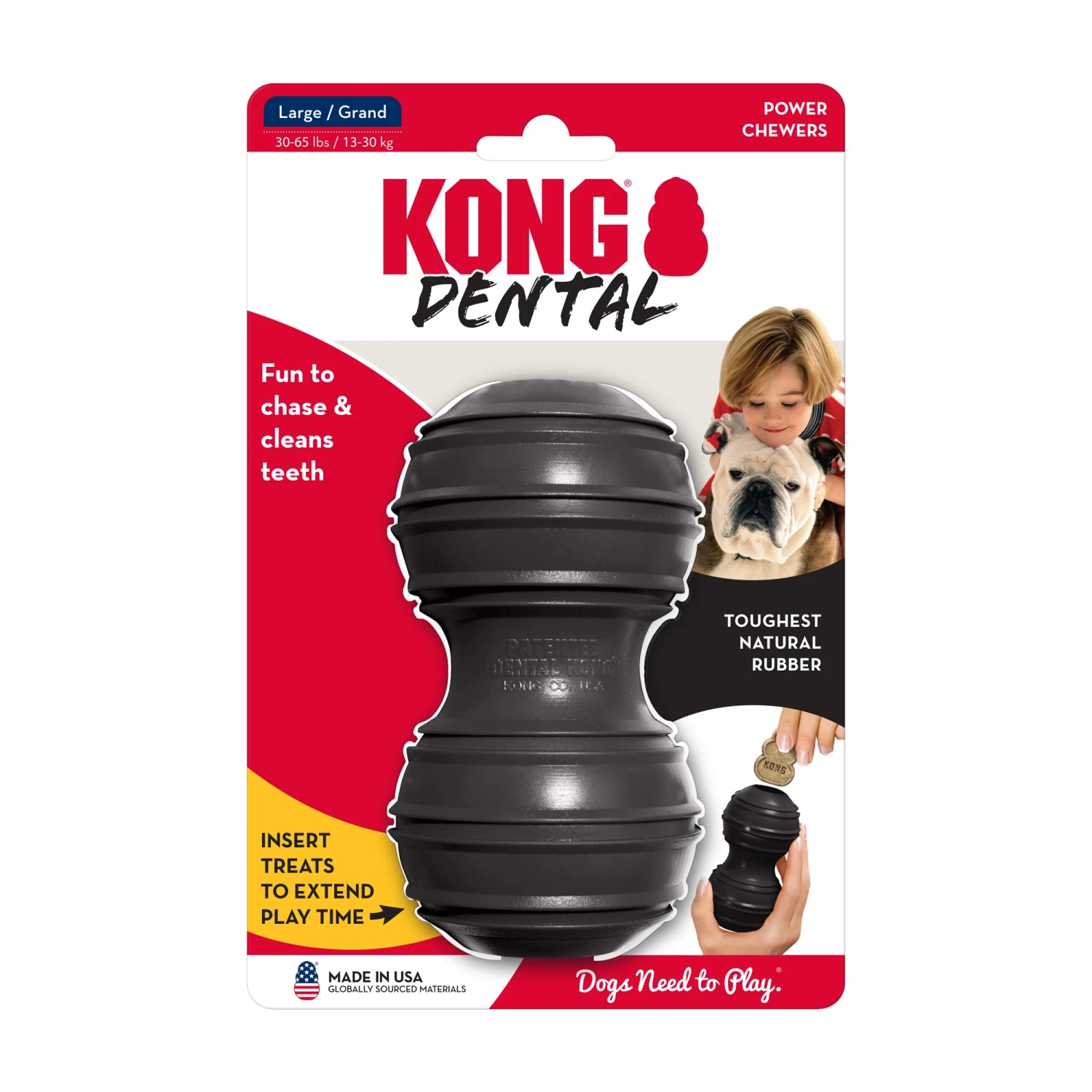 The KONG Dental rubber dog toy is designed for cleaning teeth and gums while giving an appropriate chewing outlet and supporting a dog’s instinctual needs. Made out of KONG Extreme Rubber formula, the KONG Dental toy has grooves that help clean teeth.