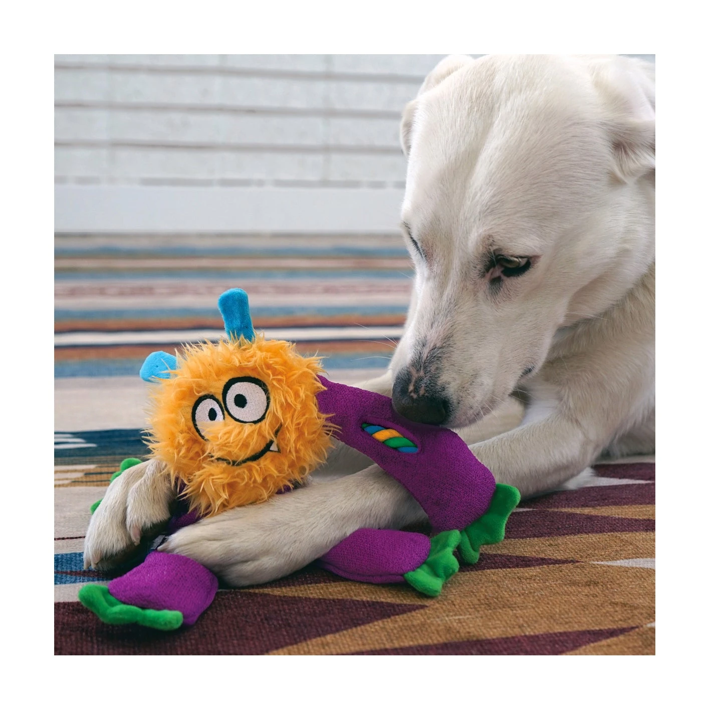 Long, dangly legs are great for shaking play. The legs, made of a grippy tennis shoe material, squeak for interactive tugging.
