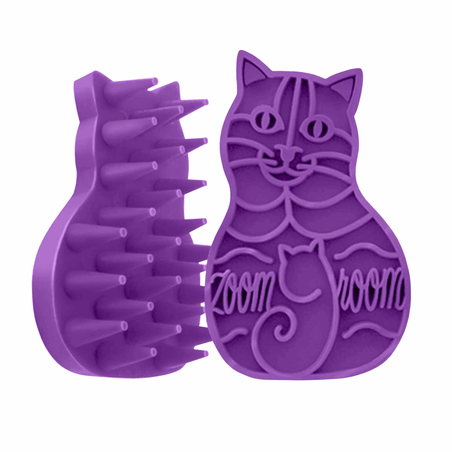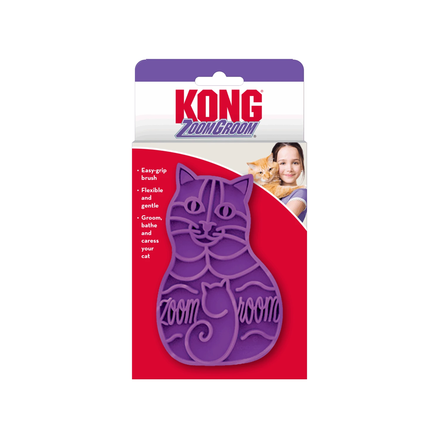 The KONG ZoomGroom for Cats massages and grooms at the same time. The soft, rubber fingers are a magnet for loose hairs. Helps condition skin and reduce hairball formation. The gentle massage action calms cats, especially in potentially traumatic situations such as veterinarian visits.