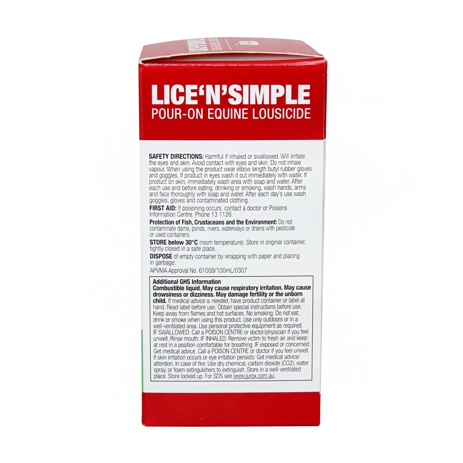 LICE ‘N’ SIMPLE is a pour-on solution for the control of biting lice on horses. It provides effective control of biting lice Werneckiella (Bovicola) equi on horses, with a single treatment.