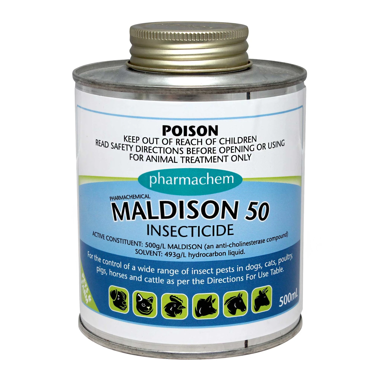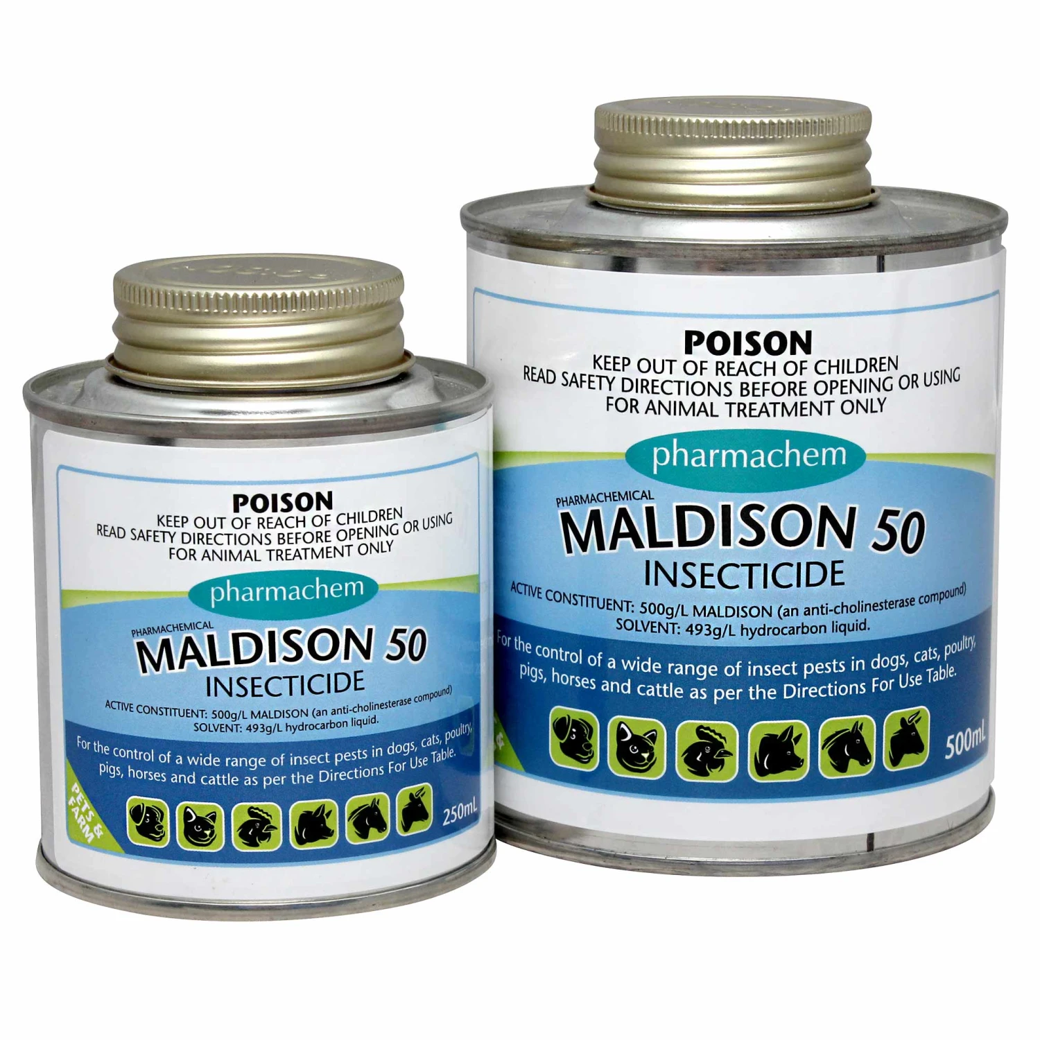 MALDISON 50 is an organo-phosphorous anti-cholinesterase compound that attacks the central nervous system of parasites – i.e. Mosquitoes, Lice, Poultry Mites, Fowl Tick, Dog Fleas, Brown Dog Tick and Sarcoptic Mange.