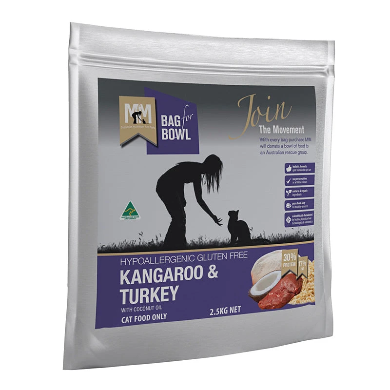 Meals for Meows Cat Kangaroo & Turkey is Hypoallergenic and Gluten Free. Also contains Brown Rice.