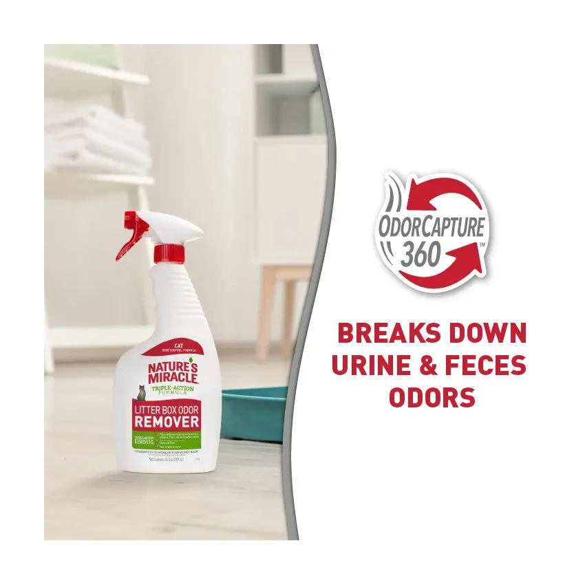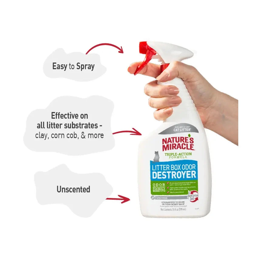 Nature’s Miracle Litter Box Odour Destroyer works to destroy tough litter box odours and remove airborne, fabric and hard-surface odours.