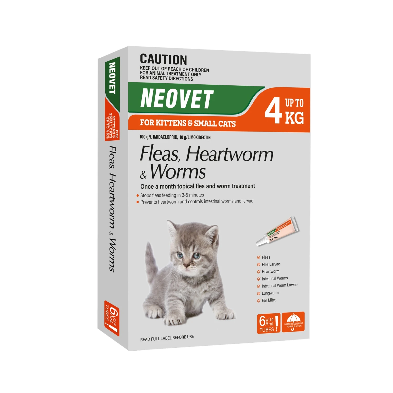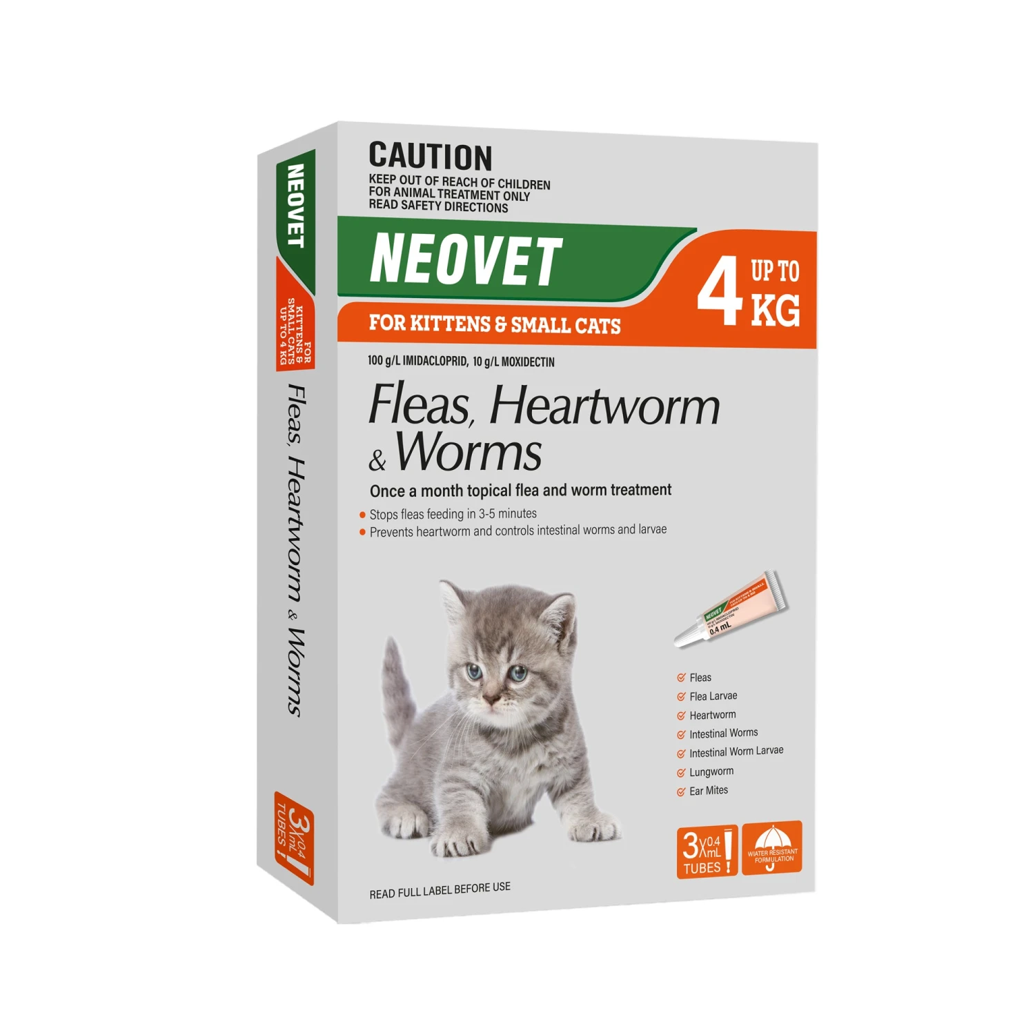 Neovet for Cats is a monthly spot-on for the treatment and control of fleas, roundworms, hookworms, ear mites and lungworms. Does not provide protection against tapeworm or ticks.