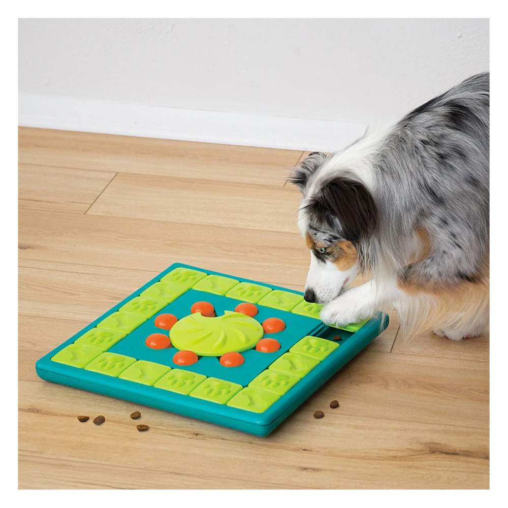 The Nina Ottosson Dog MultiPuzzle features 28 hidden treat compartments, making it very challenging! To promote problem-solving behaviours, dogs must move sliders, and combine sliding and rotating actions to uncover hidden treats. The Dog MultiPuzzle is the ultimate challenge to keep your dog busy & entertained.