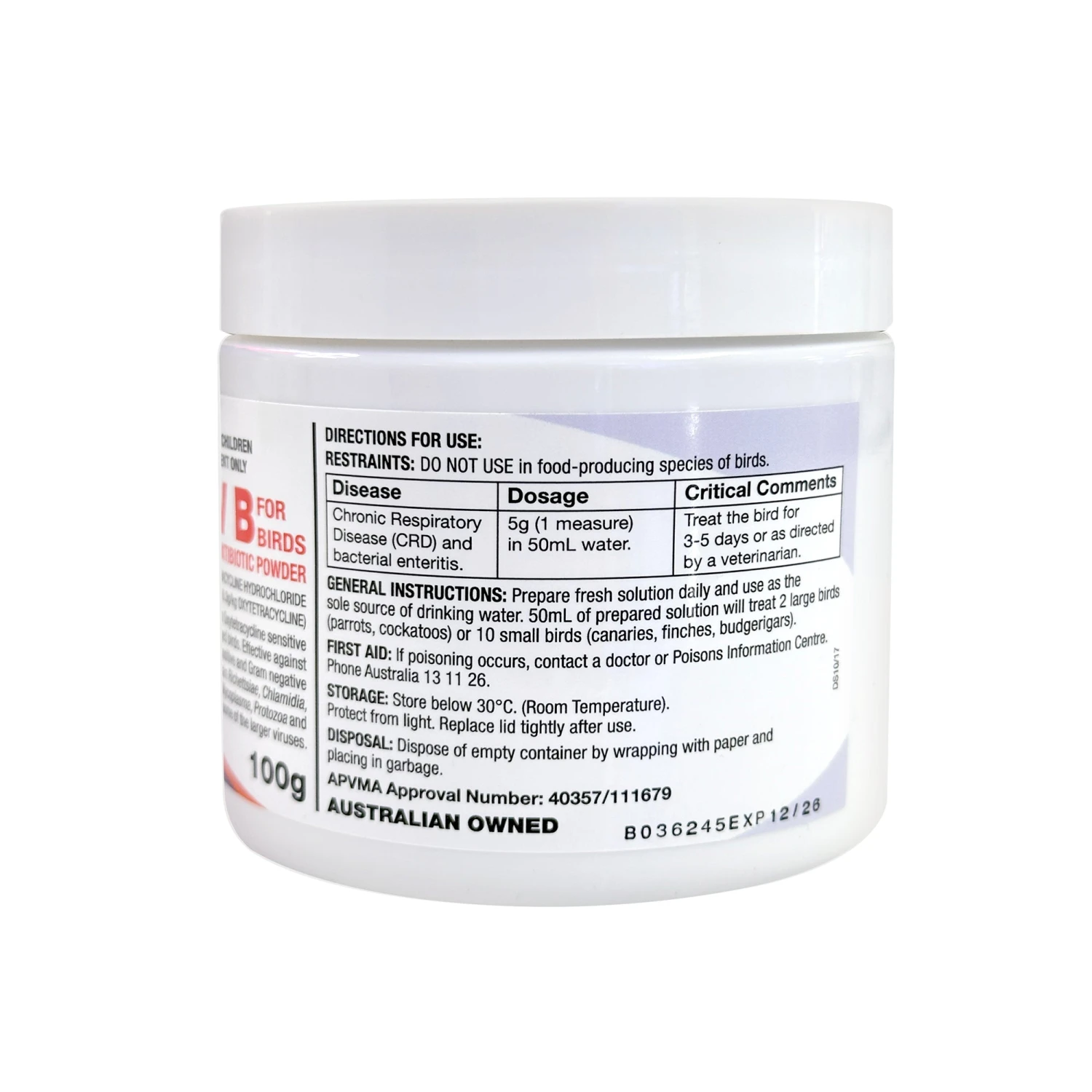 Active ingredient: Oxytetracycline hydrochloride 10g/Kg. A broad spectrum antibiotic powder for treating respiratory and general bacterial conditions in caged birds. No prescription is required for this useful medication.
