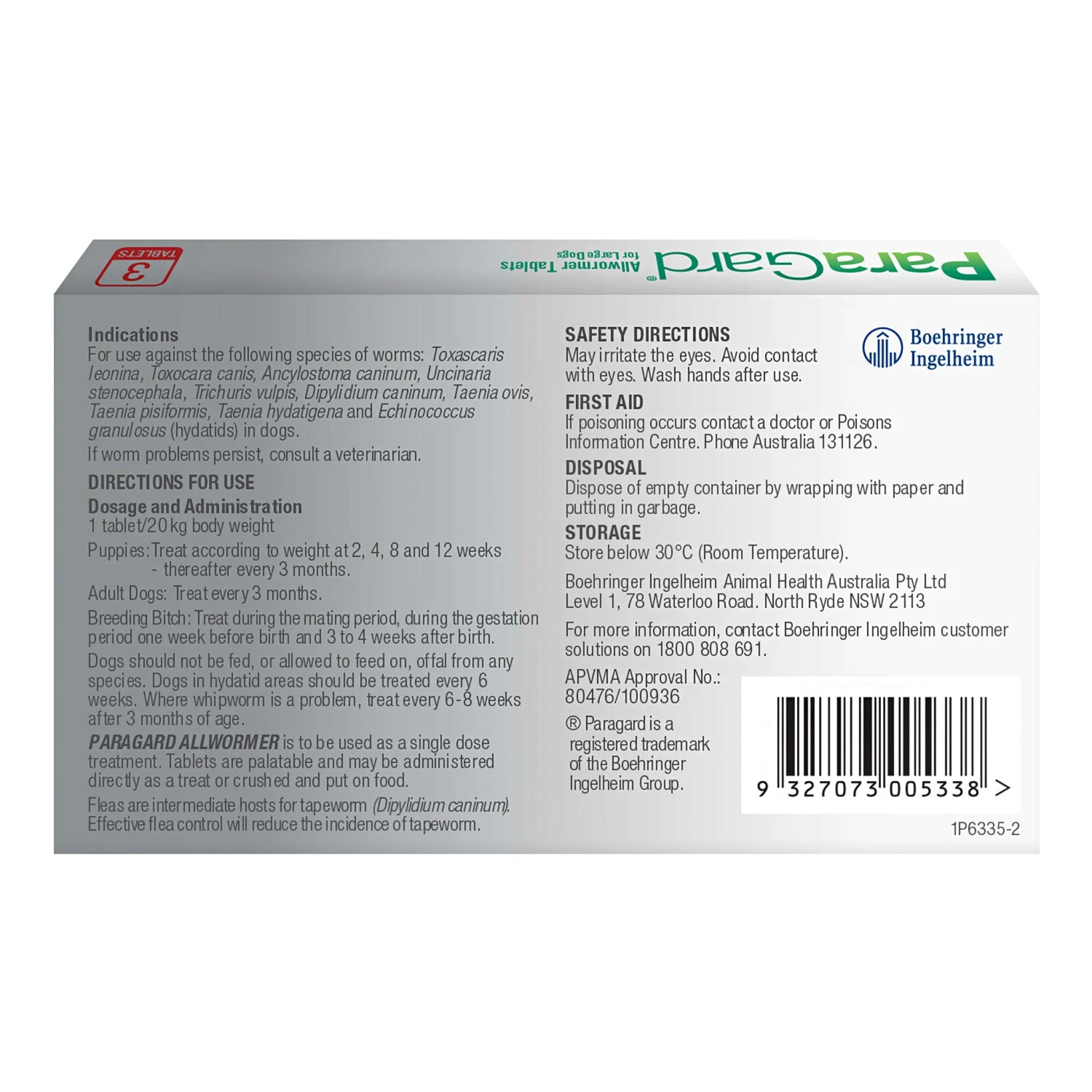 ParaGard Allwormer Tablets for Large Dogs (up to 20kg) are for the treatment and control of Roundworm, Hookworm, Whipworm and Tapeworm. Also treats hydatids in dogs.