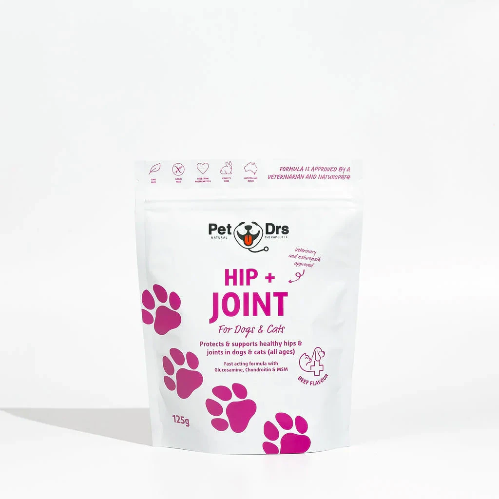 Pet Drs Hip + Joint supplement has been carefully researched and developed by a naturopath and veterinarian to optimise, maintain and support healthy hips and joints. Specifically containing Glucosamine, Chondroitin and MSM, Hip + Joint can help relieve discomfort and/or pain as well as doubling as a preventative measure for young dogs predisposed to joint issues.