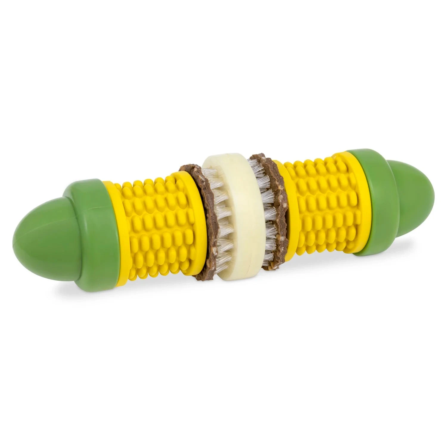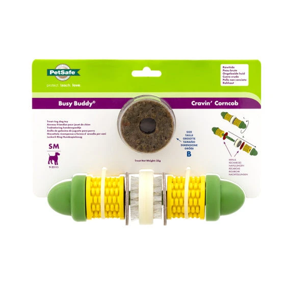 Add up to 2 treat rings by unscrewing the ends and sliding them on. For double fun, you can smear nut butter (or even doggie toothpaste!) on the corn kernels to keep your dog entertained even longer.