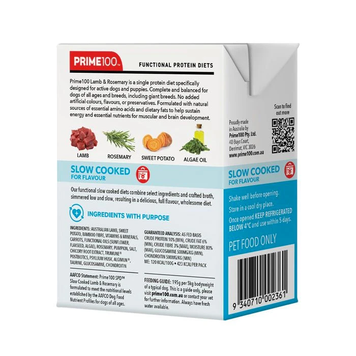 Prime100 SPD Slow Cooked Lamb & Rosemary is a single protein diet designed for active dogs and puppies.