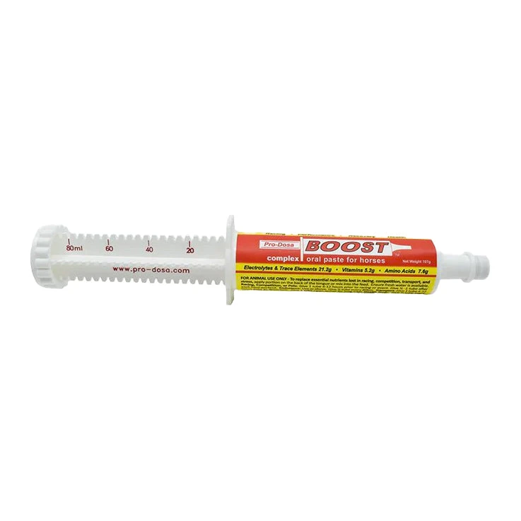 Pro-Dosa BOOST is a comprehensive, balanced, bioavailable multi-nutrient paste for horses. It has been formulated to replace essential nutrients lost in training, competition, transport, or stress.