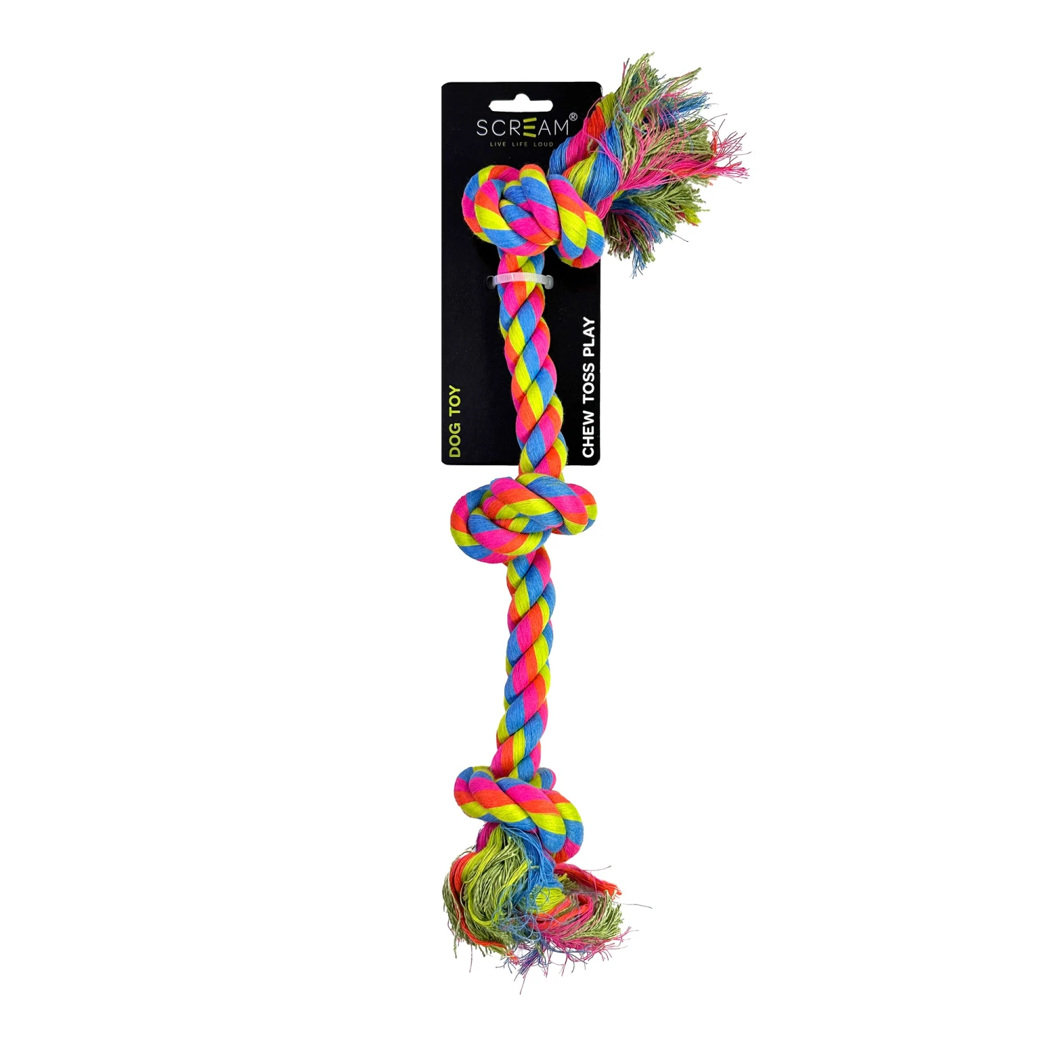 The Scream 3-Knot Rope dog toy is a brightly coloured rope that SCREAMS fun!