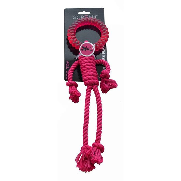 The Scream Rope Man is a cotton rope man designed for the active chewer. This toy is tough and durable and perfect for interactive games of tug.