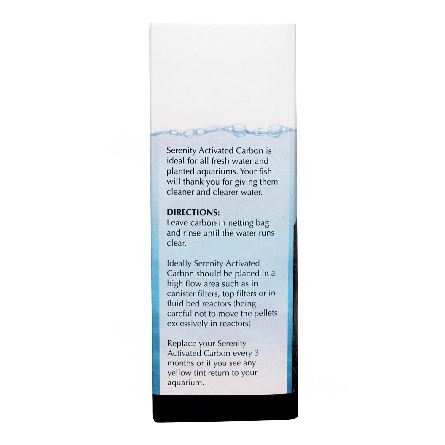Serenity Activated Carbon will give cleaner, clearer water in your aquarium. It is ideal for removing the yellow tinge in water caused by tannin staining from timber and drift woods.