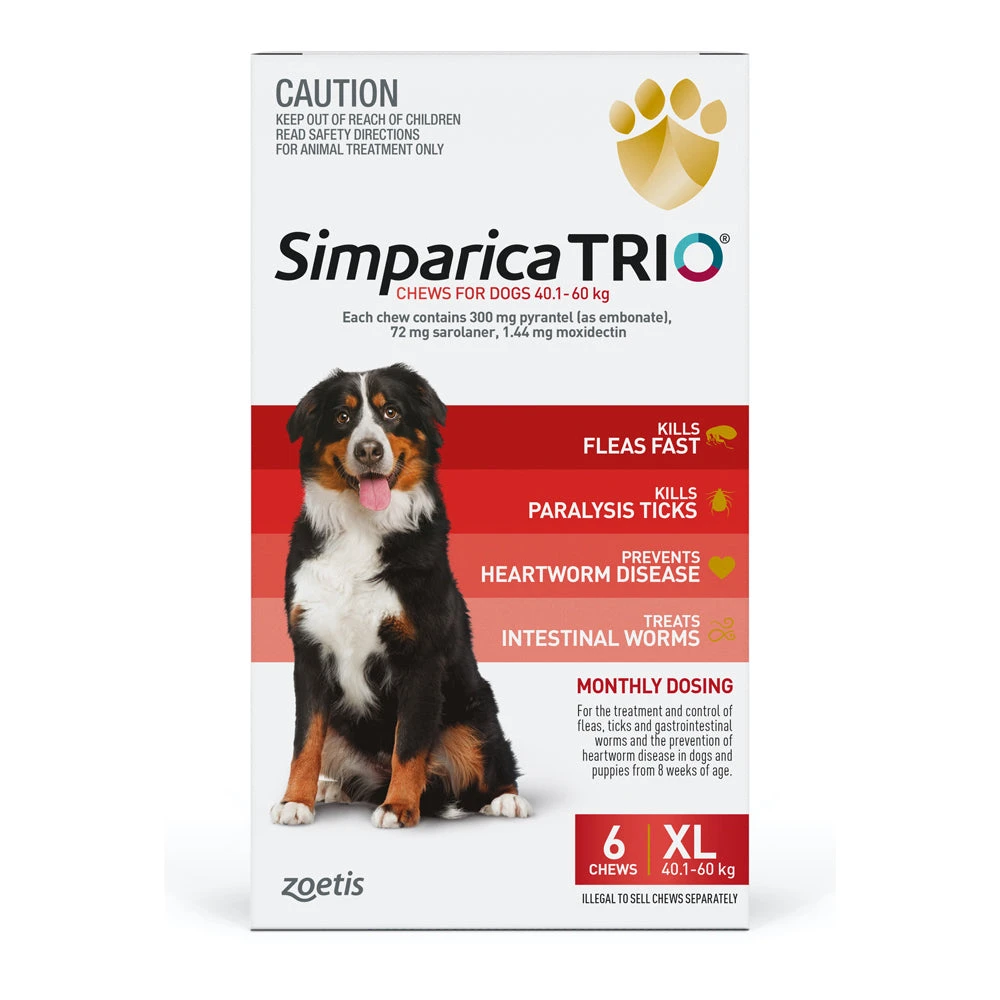 Simparica TRIO is a tasty combination chew for dogs with vet grade protection. Simparica TRIO is a tasty monthly chew that provides triple protection against a trio of the biggest threats facing our dogs, fleas and ticks, intestinal worms and deadly heartworm.