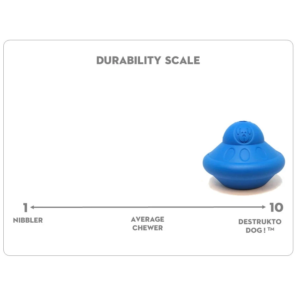 The Spotnik Flying Saucer is a durable rubber chew toy and treat dispenser.