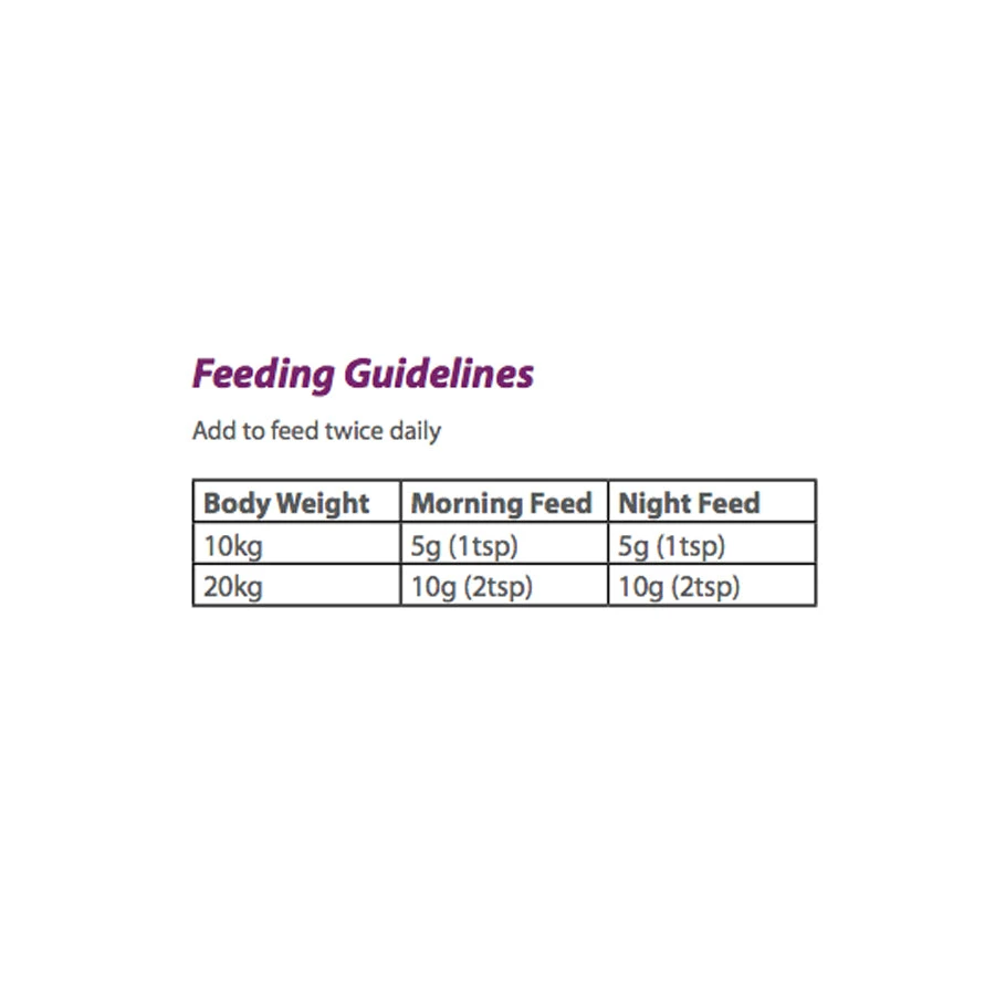 A proprietary blend [Acid Buf, Cara sweet flavouring, Curcuma xanthorrhiza, Dextrose, Gelatine, Glucosamine sulphate, Gotu kola, Ground black pepper, Hesperidin, Kelp, L-Lysine, Magnesium sulphate, Methylsulphonylmethane, EPA + DHA from fish oil, Silica, Spirulina, vitamin B1, B3, B5, Vitamin C, Zinc] 10g