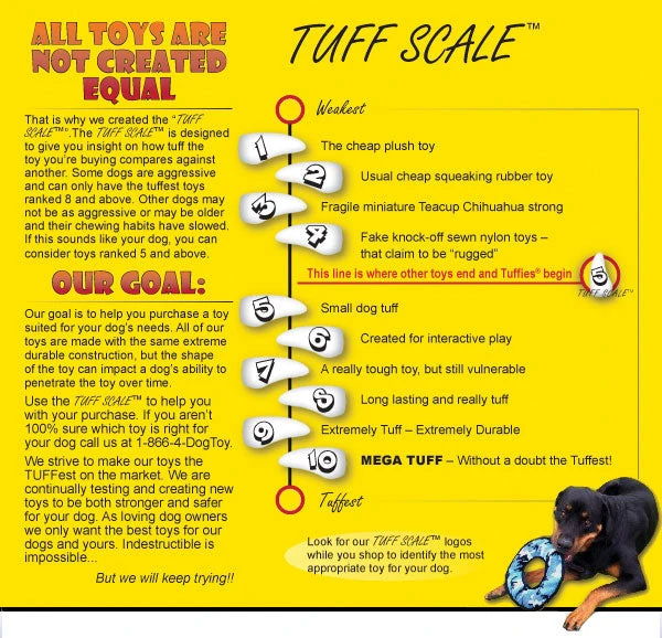 The Starfish is a colorful, fun toy that your dog will enjoy fetching and chasing. The Starfish is equipped with a squeaker that will last for hours of fun and is also easy to toss and it floats, too! Tuff Scale Rating of 5.