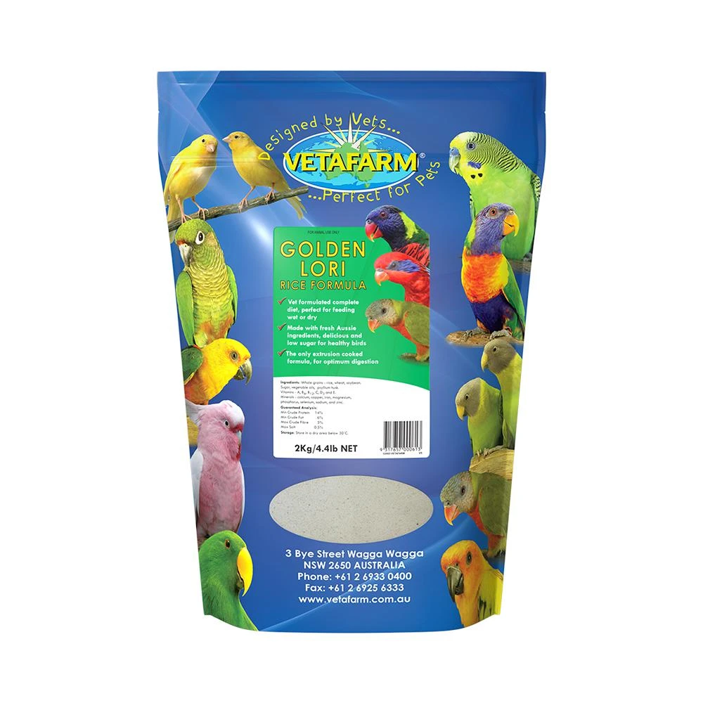 Dry: Golden Lori Rice Formula is fed as a dry food for all Lori’s and Lorikeets. Remove contaminated food daily. Wet: By adding water to Golden Lori Rice Formula a wet mix of desired consistency can be made. Empty and clean all wet food containers daily.