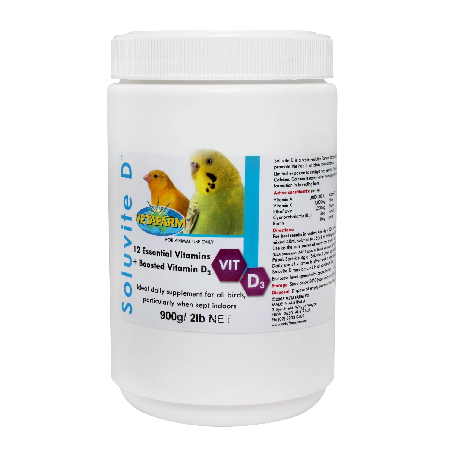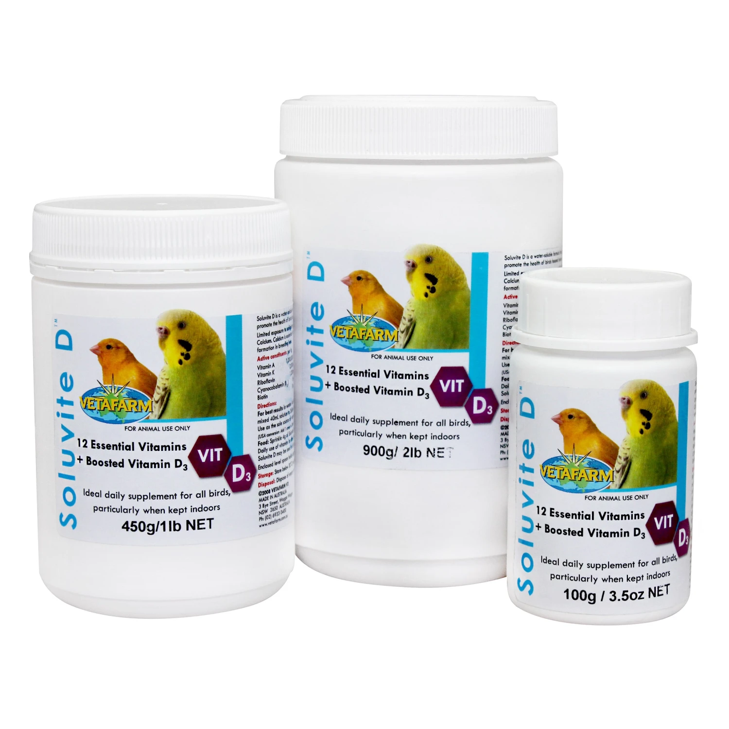 Soluvite D should be used in conjunction with a trace mineral supplement (e.g. TRACEMIN) and a calcium supplement (e.g. CALCIVET or D NUTRICAL), for birds on seed diets.