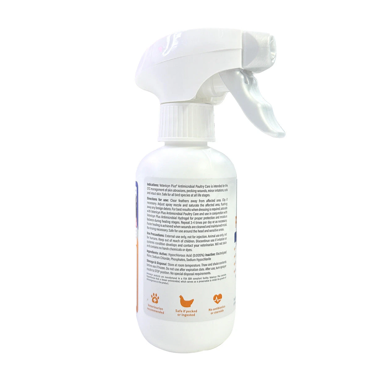 Vetericyn Plus Poultry Care is a wound care agent formulated with advanced hypochlorous technology. It is designed to clean cuts, pecking sores, scratches, and abrasions safely and effectively while helping wounds heal.