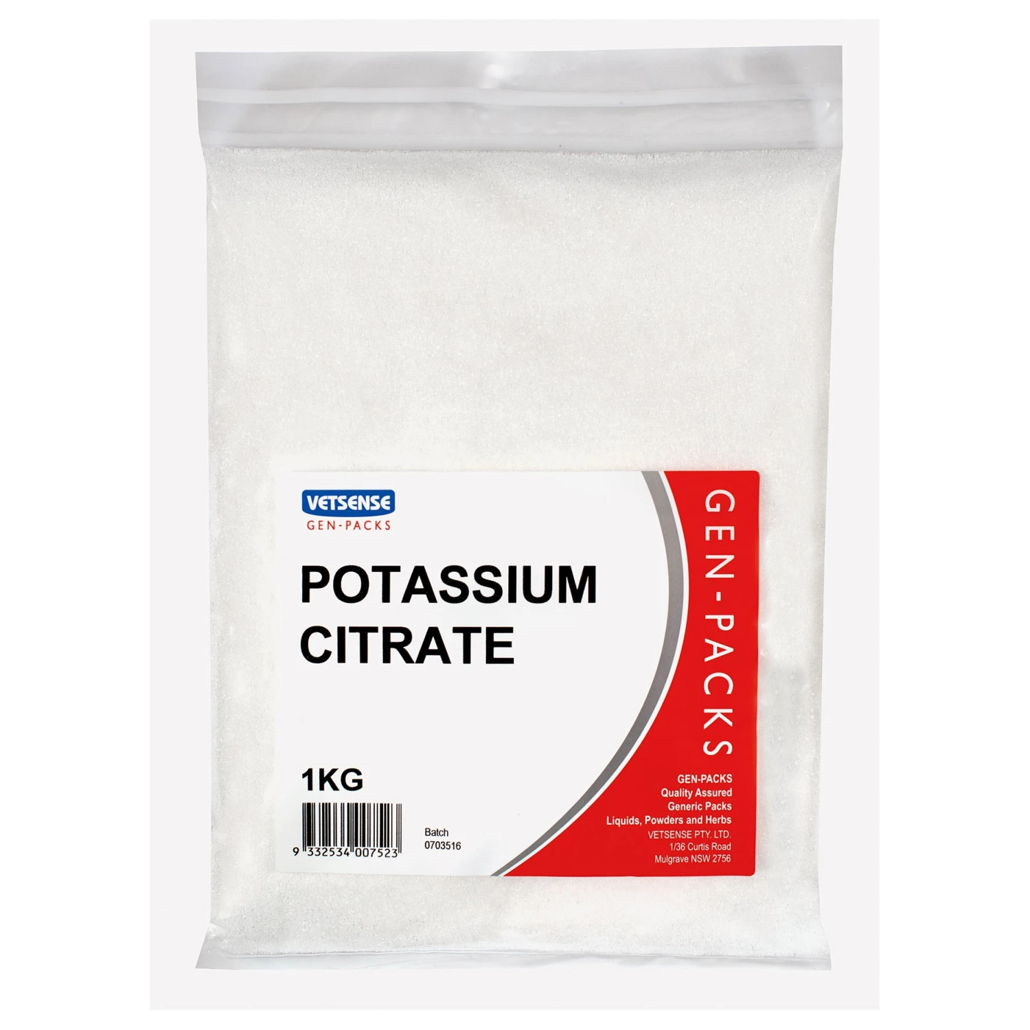 Vetsense Gen Packs Potassium Citrate. Suitable for dogs and cats that may have low potassium levels. Also suitable for horses that lose potassium when stressed during exercise.
