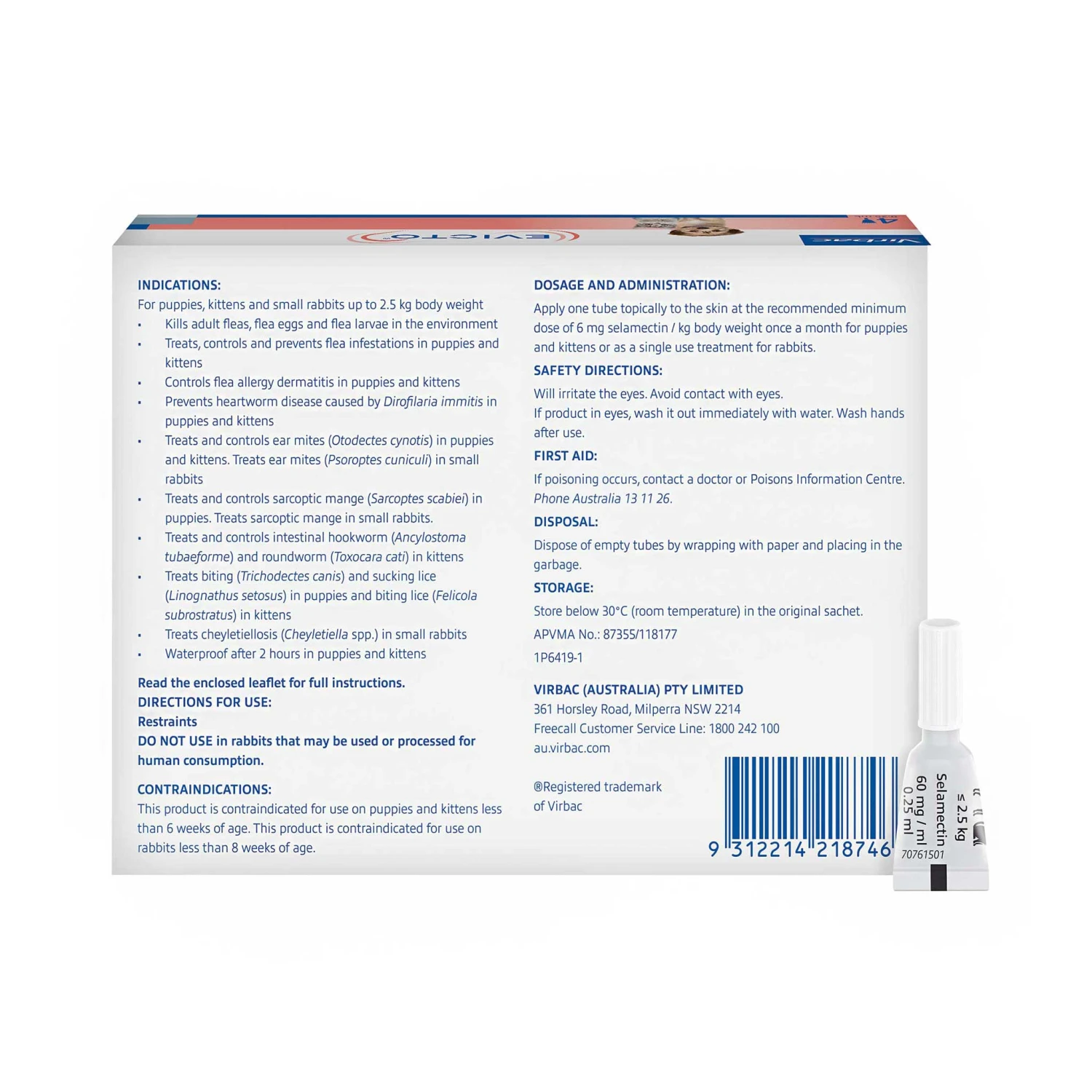 - Puppies and Kittens (and small Rabbits) (Up to 2.5kgs): 15mg selamectin
