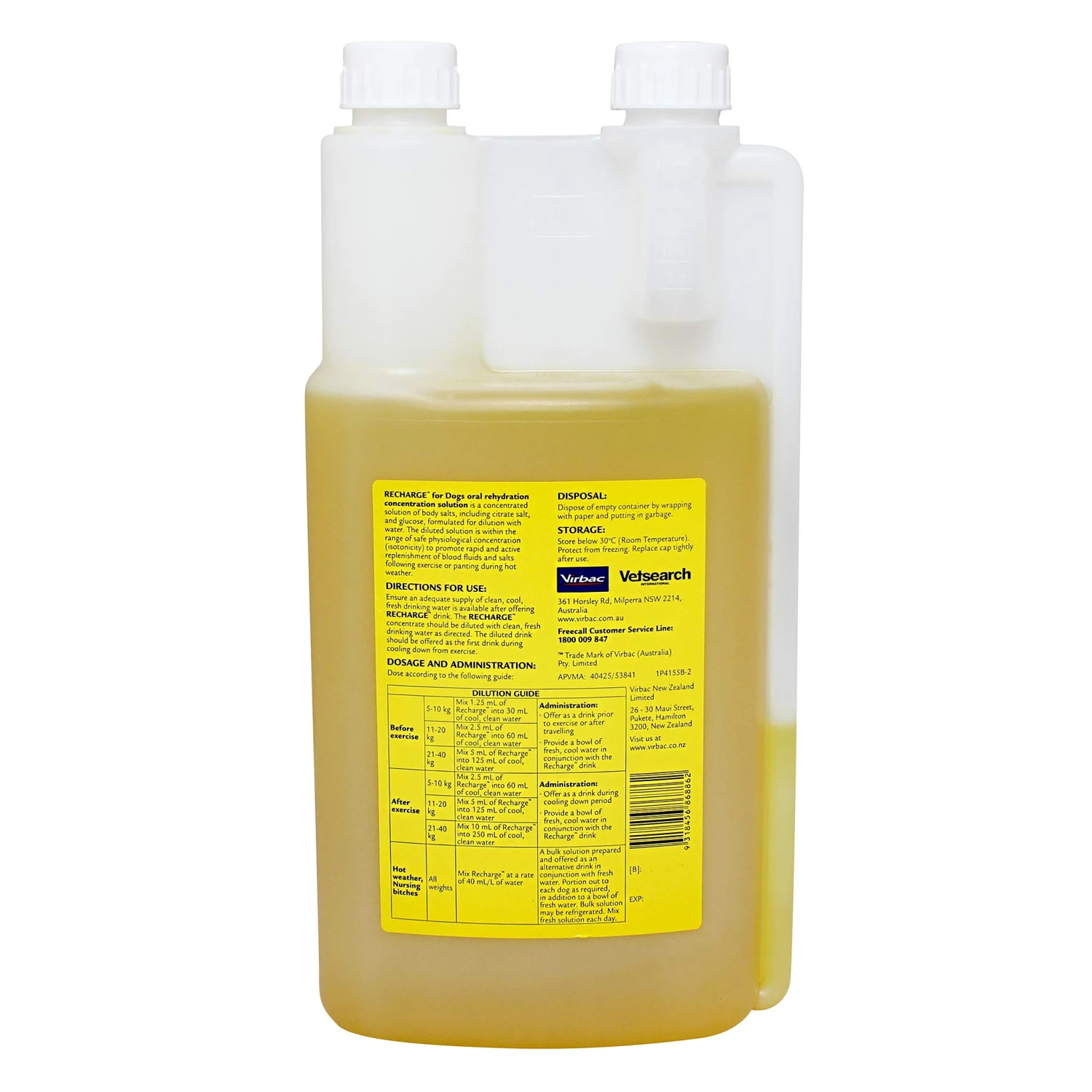 It is common for dogs to lose large quantities of fluid and electrolytes during transportation, exercise and stressful conditions. Unless these losses are replaced rapidly chronic dehydration, muscle cramping, loss of performance and nervousness can occur. RECHARGE rapidly replenishes electrolytes and fluids after travelling and racing. The product lives up to its name in providing a rapid restoration of fluid and vitality. The formulation is specifically matched to the needs of the hard working dog, containing: A. a high potassium to sodium ratio, important for nerve and muscle function. B. Citrate salt as a buffering agent and C. Glucose to enhance rapid uptake of electrolytes.