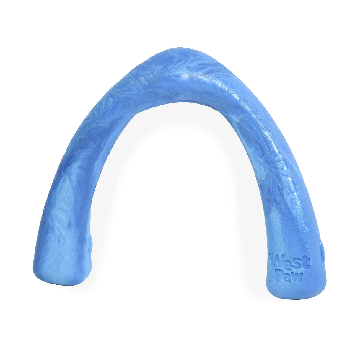 The West Paw Snorkl is a wishbone-shaped tug, toss, and fetch dog toy that is squeaker free and features flexible, durable material.